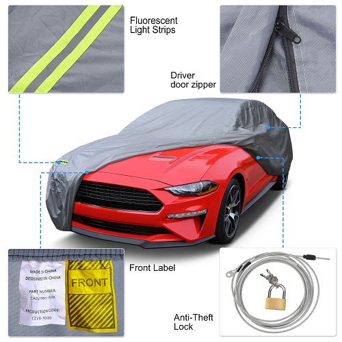 Features: 1. Driver door zipper. 2. Reflective strips. 3. Car cover front label. 4.anti-theft lock. 5.storage bag.